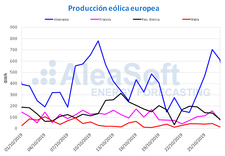 La producción eólica en Francia y la Península Ibérica bajó significativamente la semana pasada respecto a la semana del 14 de octubre, siendo la diferencia del ‑36% en España la más notable. En Alemania la producción con esta tecnología fue un 12% superior que la de la semana anterior, mientras que el incremento porcentual en Italia fue del 6,0%. Para esta semana se esperan aumentos en la generación con esta tecnología en Francia y España, y bajadas en el resto de los países analizados.