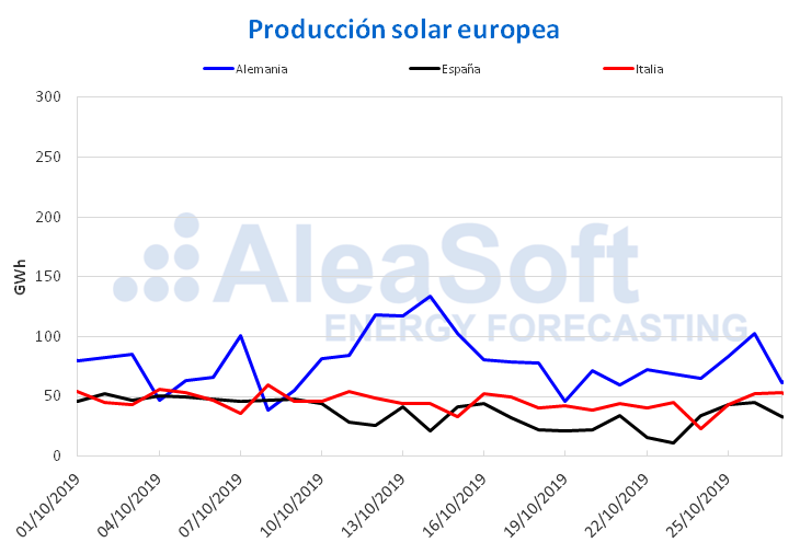 Durante los días transcurridos de octubre, la producción solar en España ha sido mayor que la de octubre de 2018, con un aumento del 28%. En Italia la producción con esta tecnología se ha incrementado en un 11% respecto al mismo período del año pasado, mientras que en Alemania ha decrecido un 18%.