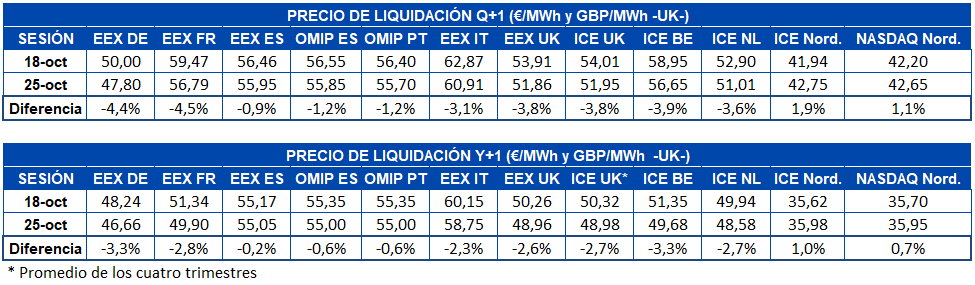 La comparación de los precios de los futuros de electricidad entre el pasado viernes 25 de octubre y el viernes 18 de octubre muestra una bajada para el producto del primer trimestre de 2020 en casi todos los mercados europeos, a excepción de los países nórdicos. Tanto en el mercado ICE como en el mercado NASDAQ, los futuros para el próximo trimestre de los países nórdicos han registrado subidas del 1,9% y 1,1% respectivamente. Mientras tanto, en el resto de los mercados europeos analizados el mayor cambio se aprecia en el mercado EEX de Francia, con una diferencia del ‑4,5%, mientras que los futuros de España, también de EEX, han sido los de menor bajada para este producto, con un descenso del ‑0,9%.