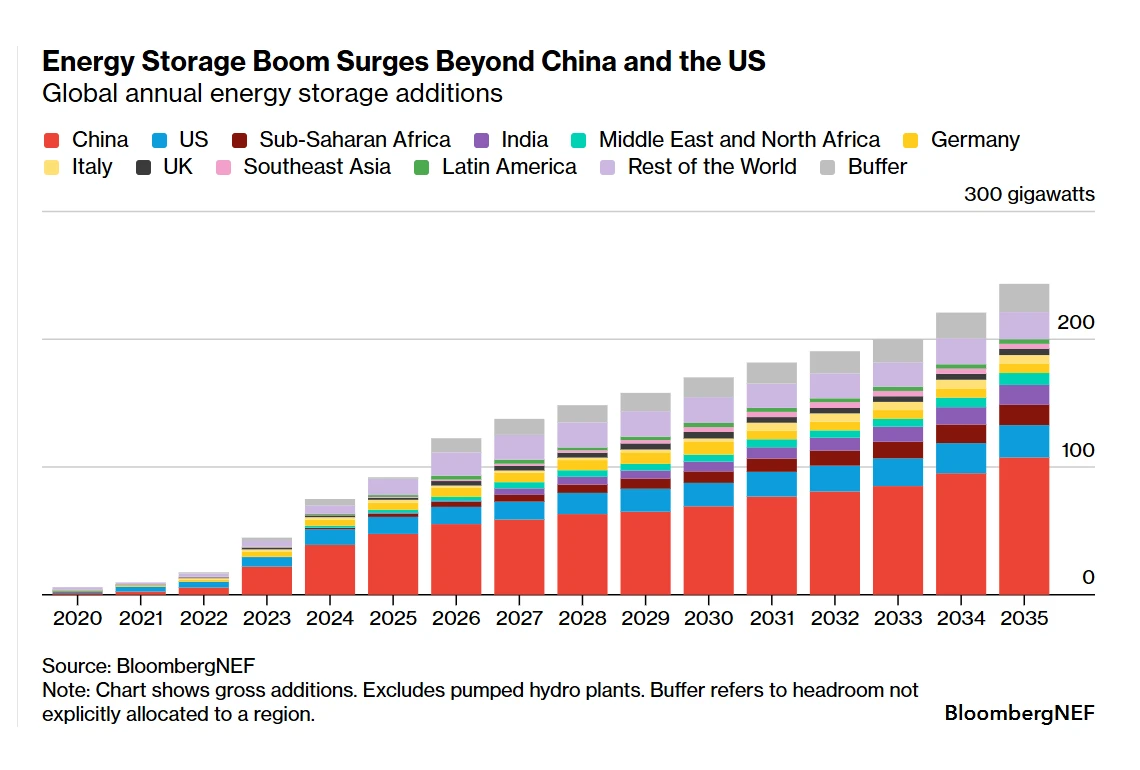 Las adiciones mundiales de almacenamiento de energía están en camino de establecer otro récord en 2025 con los dos mercados más grandes, China y EEUU, superando cambios de política adversos y turbulencias arancelarias. Los despliegues anuales también se ampliarán en Alemania, Reino Unido, Australia, Canadá, Arabia Saudita y África subsahariana, impulsados por políticas de apoyo, adquisiciones por parte de empresas de servicios públicos y dinámica del mercado eléctrico.