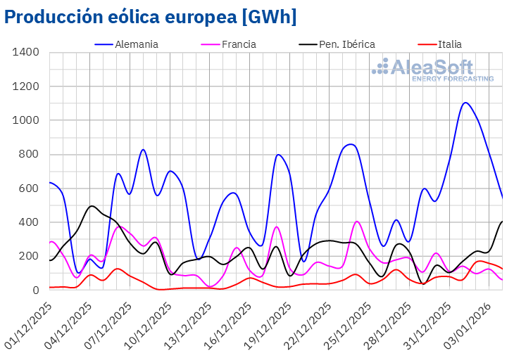 En la semana del 29 de diciembre, el aumento de los precios del gas y el incremento de la demanda en la mayoría de los mercados propiciaron la subida de los precios en los mercados eléctricos europeos. Además, la caída de la producción eólica contribuyó al incremento de los precios en los mercados español y francés. En cambio, en los mercados alemán e italiano, la producción eólica subió, favoreciendo el descenso de los precios en esos mercados.