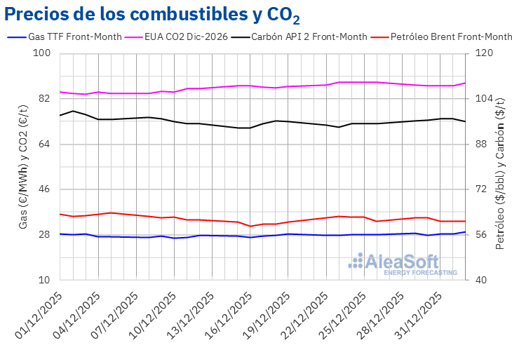 Por lo que respecta a los precios de cierre de los futuros de derechos de emisión de CO2 en el mercado EEX para el contrato de referencia de diciembre de 2026, se mantuvieron por debajo de 87,50 €/t en las últimas tres sesiones de 2025. El martes 30 de diciembre, estos futuros registraron su precio de cierre mínimo semanal, de 87,28 €/t. En cambio, el viernes 2 de enero, estos futuros alcanzaron su precio de cierre máximo semanal, de 88,31 €/t. Según los datos analizados en AleaSoft Energy Forecasting, este precio fue un 0,3% mayor al del viernes anterior.