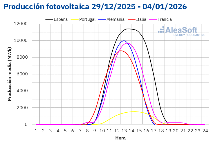 En la semana del 29 de diciembre, la producción solar fotovoltaica aumentó un 38% en el mercado francés y un 16% en el mercado italiano, en ambos casos por segunda semana consecutiva. En cambio, tras los aumentos de la semana anterior, la producción solar disminuyó un 13% en Portugal y un 4,9% en España.