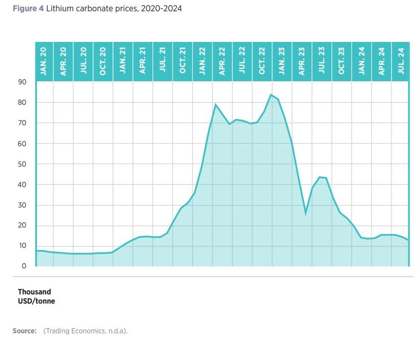 Como se ve en la Figura 4, los precios del carbonato de litio han bajado desde entonces, por lo que aún está por verse si las SIB son una alternativa más económica que las LIB —en particular las baterías de fosfato de hierro y litio (LFP)— a largo plazo. Algunas fuentes sitúan el umbral de precio del carbonato de litio de calidad para baterías en 20.000 USD por tonelada para que las SIB mantengan su ventaja competitiva en términos de costos (BMI, 2024b).