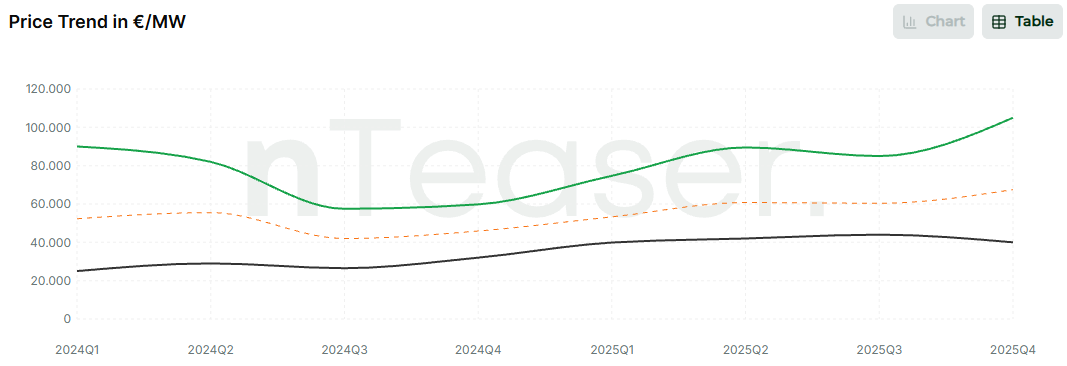 La evolución de precios muestra una fase de ajuste a lo largo de 2024, seguida de una recuperación progresiva durante 2025. En el cuarto trimestre, el precio máximo de los proyectos analizados superó los 105.000 €/MW, mientras que la media se situó alrededor de los 67.500 €/MW y los valores mínimos ya se aproximan a los 40.000 €/MW, reflejando un fortalecimiento generalizado del mercado.