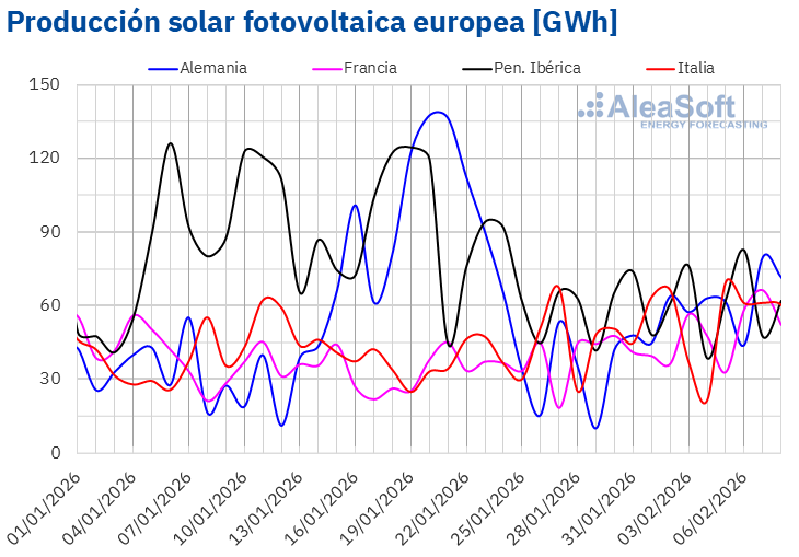 Los mercados italiano y francés registraron niveles de producción fotovoltaica diaria que no se alcanzaban desde noviembre. El jueves 5 de febrero, el mercado italiano generó 69 GWh de energía solar, un nivel no registrado desde el 12 de noviembre. Dos días después, el mercado francés alcanzó una producción de 66 GWh, valor no observado desde el 4 de noviembre.