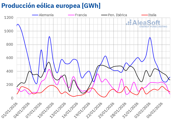 En la semana del 9 de febrero, según las previsiones de producción eólica de AleaSoft Energy Forecasting, la producción con esta tecnología aumentará en los mercados español y francés. Por el contrario, se espera que disminuya en los mercados italiano, alemán y portugués.