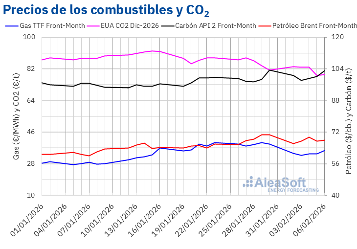 Los precios de cierre de los futuros de petróleo Brent para el Front‑Month en el mercado ICE se mantuvieron por debajo de 70 $/bbl durante la primera semana de febrero. El lunes 2 de febrero, estos futuros registraron su precio de cierre mínimo semanal, de 66,30 $/bbl. En las siguientes sesiones, los precios subieron. El 4 de febrero, los futuros de petróleo Brent alcanzaron su precio de cierre máximo semanal, de 69,46 $/bbl. Sin embargo, en las últimas sesiones de la semana, los precios permanecieron por debajo de 68,50 $/bbl. El viernes 6 de febrero el precio de cierre fue de 68,05 $/bbl. Según los datos analizados en AleaSoft Energy Forecasting, este precio fue un 3,7% menor al del viernes anterior.