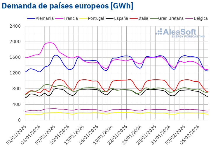 Para la semana del 9 de febrero, según las previsiones de demanda de AleaSoft Energy Forecasting, la tendencia negativa continuará y la demanda disminuirá en los mercados alemán, francés, italiano y español. Por el contrario, la demanda aumentará en los mercados portugués, británico y belga.
