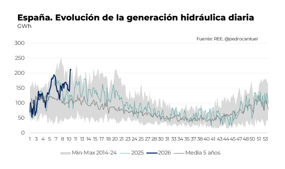 El caso es que las centrales hidroeléctricas están superando los 200 GWh al día durante esta semana, algo que llevaba tiempo sin verse, y que a estas alturas del año nunca se había dado.