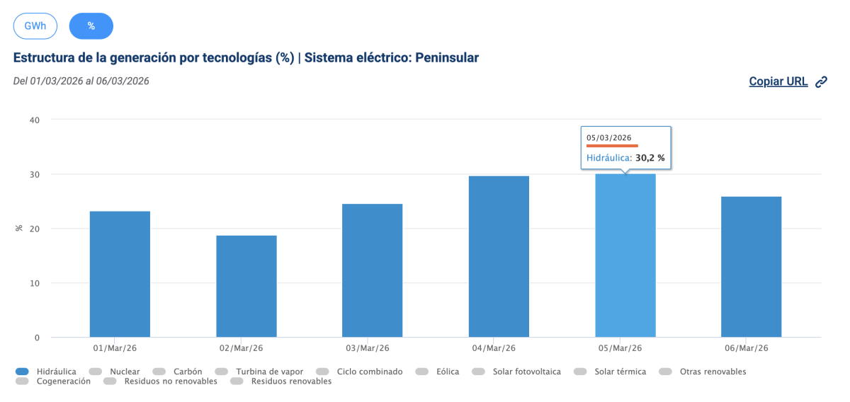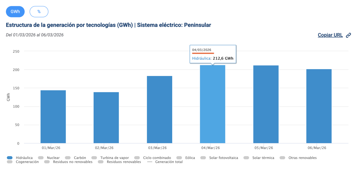 Para que se entienda mejor, este martes y miércoles pasados se generó en España 212 GWh/día, lo que significa que el 30% del mix eléctrico peninsular se obtuvo gracias a las centrales hidroeléctricas.