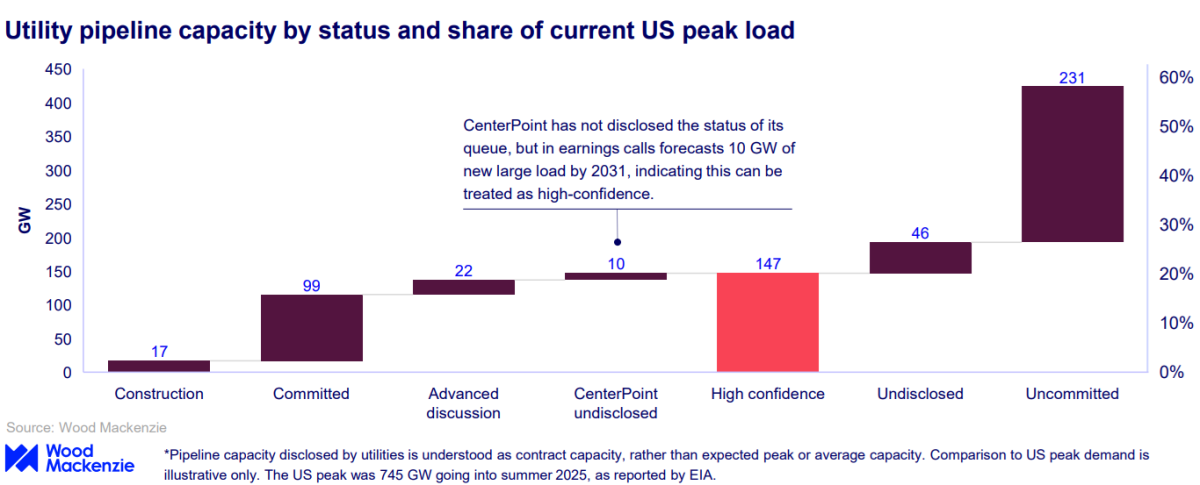 El informe, titulado “No turning back, an analysis of utility large load pipelines” (“Sin vuelta atrás, un análisis de las carteras de carga grande de las eléctricas”), muestra que una parte significativa de esta capacidad entrará en funcionamiento durante esta década, con 60 GW previstos hasta 2030, lo que equivale al 8% de la demanda máxima actual. Se espera que las empresas eléctricas tengan 93 GW operativos para 2035, después de lo cual se ha revelado poca capacidad adicional.