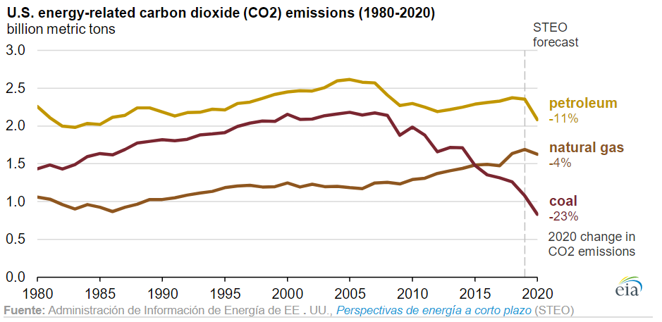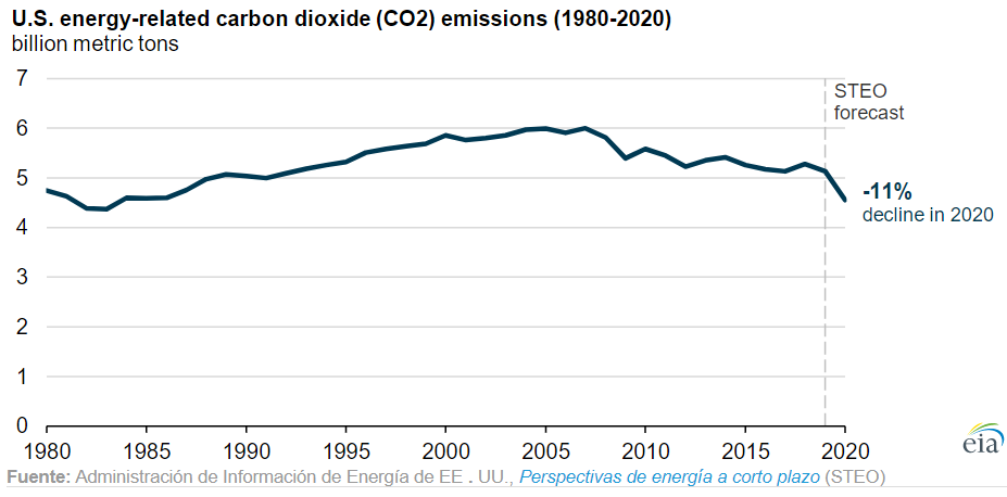La Administración de Información de Energía de EEUU (EIA) pronostica que las emisiones de dióxido de carbono (CO2) relacionadas con la energía de EEUU disminuirán en un 11% en 2020. Si se concreta, esta disminución representaría la mayor disminución no solo en porcentaje sino también en términos absolutos desde que la EIA comenzara a realizar estas estadísticas en 1949. En la última Perspectiva Energética a Corto Plazo de la EIA, ya se pronosticaba que las emisiones de CO2 relacionadas con la energía de EEUU caerían más que el 5% que lo hará el Producto Interno Bruto (PIB) en 2020.