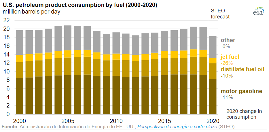 A mediados de marzo, la demanda en Estados Unidos de productos derivados del petróleo comenzó a disminuir y, a mediados de abril, alcanzó sus niveles más bajos en décadas. Las medidas de confinamiento, las restricciones de movilidad y los arreglos para trabajar desde casa redujeron la demanda de gasolina, diésel y combustible para aviones. El petróleo es la mayor fuente individual de emisiones de CO2 relacionadas con la energía en Estados Unidos, y representa el 46% del total de 2019. En el último pronóstico a corto plazo de la EIA, el consumo de productos derivados del petróleo disminuye en un 11% en 2020, y las emisiones de CO2 relacionadas con el petróleo disminuyen en un 12%.