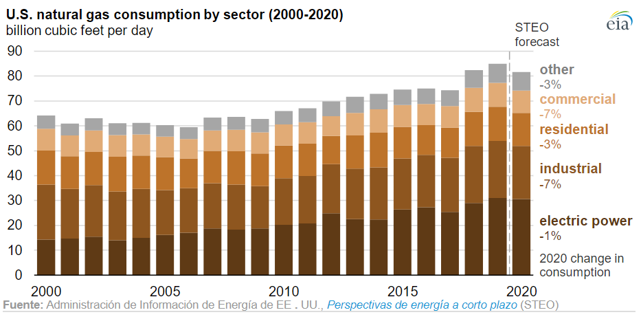 El gas natural es el segundo mayor productor de emisiones de CO2 de EEUU relacionadas con la energía, con un 33% del total en 2019. En comparación con el petróleo y el carbón, EIA espera una disminución relativamente menor en el consumo de gas natural y sus emisiones de CO2 relacionadas (ambas un 4% más bajas) en 2020. El sector eléctrico es el mayor consumidor de gas natural, y aunque EIA pronostica que la generación eléctrica disminuirá un 5%, la EIA espera que el gas natural consumido por el sector eléctrico solo disminuya en un 1% debido a los precios relativamente bajos del gas natural. El cierre o la operación reducida de muchos negocios no esenciales, combinados con un clima generalmente más cálido en 2020, conduce a una disminución en el consumo de gas natural en el sector comercial.