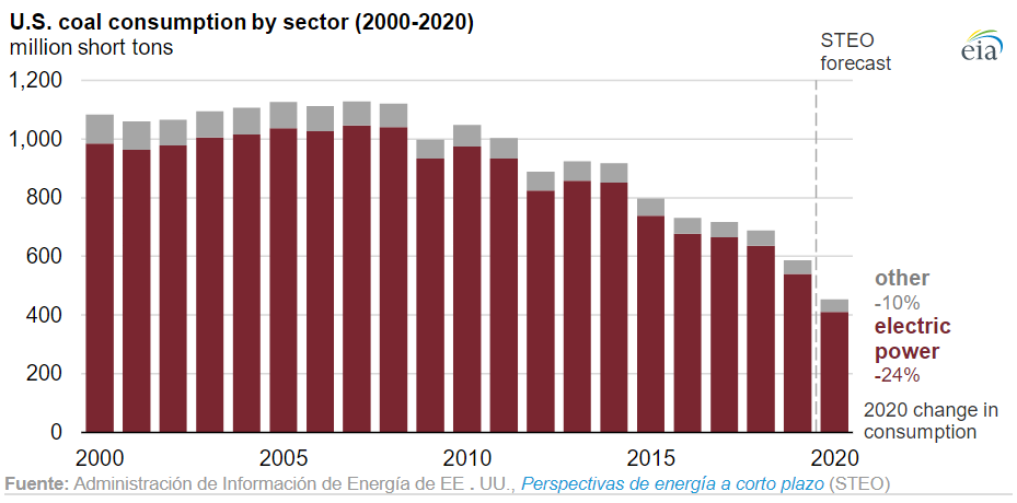 Las emisiones del carbón han disminuido en cada uno de los últimos seis años, y representaron el 21% del total de 2019. El último pronóstico de EIA espera que las emisiones de CO2 del carbón caigan un 23% en 2020 a 832 millones de toneladas, o menos de la mitad de su nivel máximo en 2007. El sector eléctrico representó más del 90% del carbón consumido en los Estados Unidos en 2019 , y EIA espera que el carbón continúe perdiendo participación de mercado frente al gas natural y las energías renovables en el sector eléctrico en 2020.