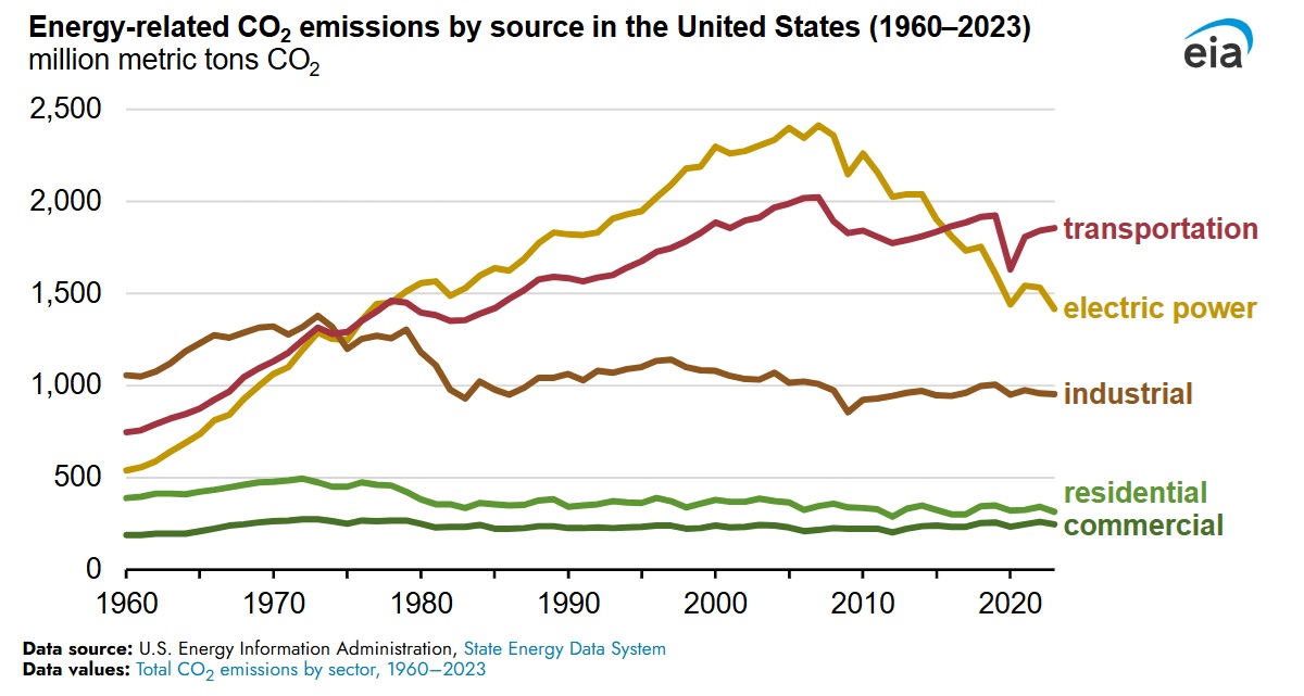 A nivel nacional, el sector eléctrico fue el mayor emisor de CO2 en Estados Unidos hasta 2016, cuando el sector transporte lo superó. Las emisiones totales de CO2 en EEUU alcanzaron su punto máximo tanto para el sector eléctrico como para el de transporte en 2007. Las emisiones del sector eléctrico han disminuido más rápidamente desde entonces debido al cambio en la matriz de generación eléctrica, alejándose del carbón y acercándose al gas natural, la energía eólica y la solar. Desde 2007, la matriz energética del transporte se ha mantenido relativamente estable, a pesar del aumento en las ventas de vehículos eléctricos y de la menor demanda de combustibles de transporte derivados del petróleo desde la pandemia de COVID-19.