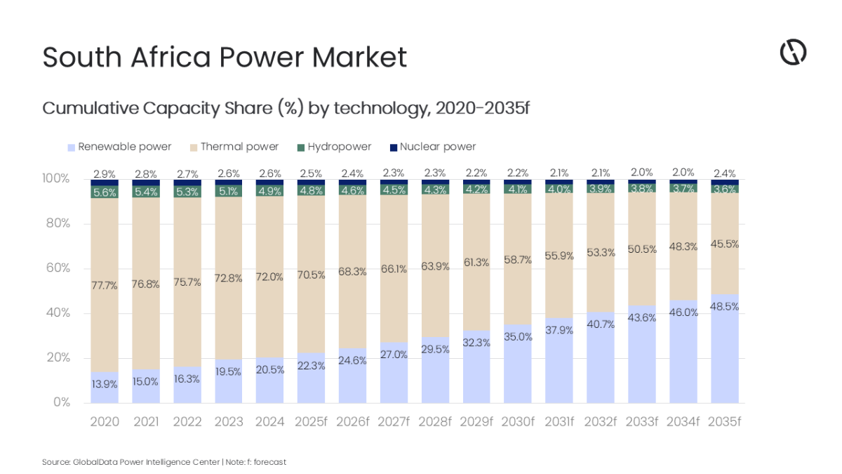 El último informe de GlobalData, “South Africa Power Market Trends and Analysis by Capacity, Generation, Transmission, Distribution, Regulations, Key Players and Forecast to 2035”, revela que se proyecta que las energías renovables representen el 31,3% de la generación eléctrica total del país para 2035, frente al 8,9% en 2024. La energía térmica representó el 72% de la participación total de la capacidad en el país en 2024.