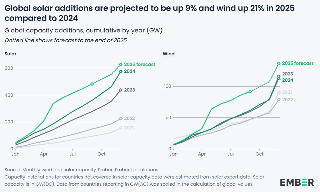 Un informe de Ember indica que se espera la incorporación de 793 GW de capacidad renovable durante 2025, un aumento del 11% con respecto a los 717 GW de 2024