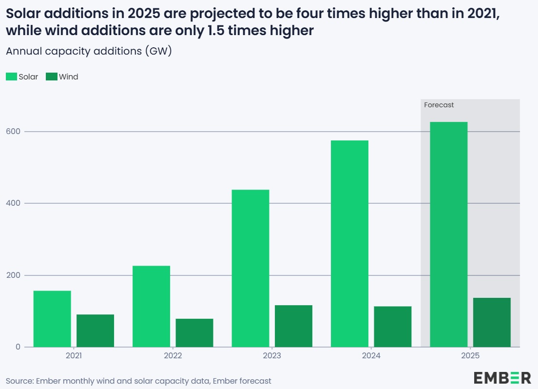 El aumento de la capacidad de energías renovables desde 2022 se ha debido al fuerte crecimiento de la energía eólica y a un incremento exponencial de la capacidad solar. Se prevé que la capacidad solar instalada anualmente en 2025 sea cuatro veces mayor que en 2021, mientras que la energía eólica ha aumentado un 50%. Este año, la capacidad solar instalada casi quintuplica la eólica.