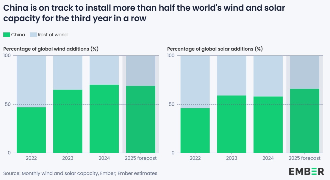 En 2025, Ember prevé que China instalará el 66% de la capacidad solar mundial y el 69% de la capacidad eólica mundial. En 2022, China representaba menos de la mitad de las nuevas instalaciones solares y eólicas a nivel mundial (46% y 47%, respectivamente). Este notable crecimiento convierte a China en el principal impulsor, con diferencia, del desarrollo global de las energías renovables.