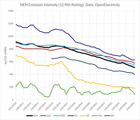 Citando datos de OpenElectricity, Osmond mostró que la intensidad media de emisiones del NEM durante los 12 meses hasta principios de febrero fue de 510 kilogramos de CO2 equivalente (kg CO2e) por megavatio-hora (MWh).