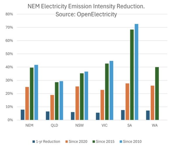 La intensidad media de emisiones del Mercado Nacional de Electricidad (NEM) de Australia ha disminuido un 25 % desde 2020 y un 40 % desde 2015