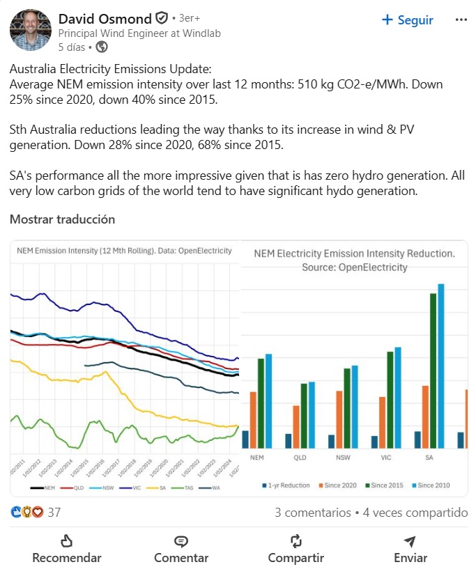 David Osmond, ingeniero principal de energía eólica en WindLab, propietario y operador de algunos de los proyectos de energía renovable más importantes del país, destacó recientemente en su cuenta de LinkedIn una actualización sobre las emisiones eléctricas de Australia.