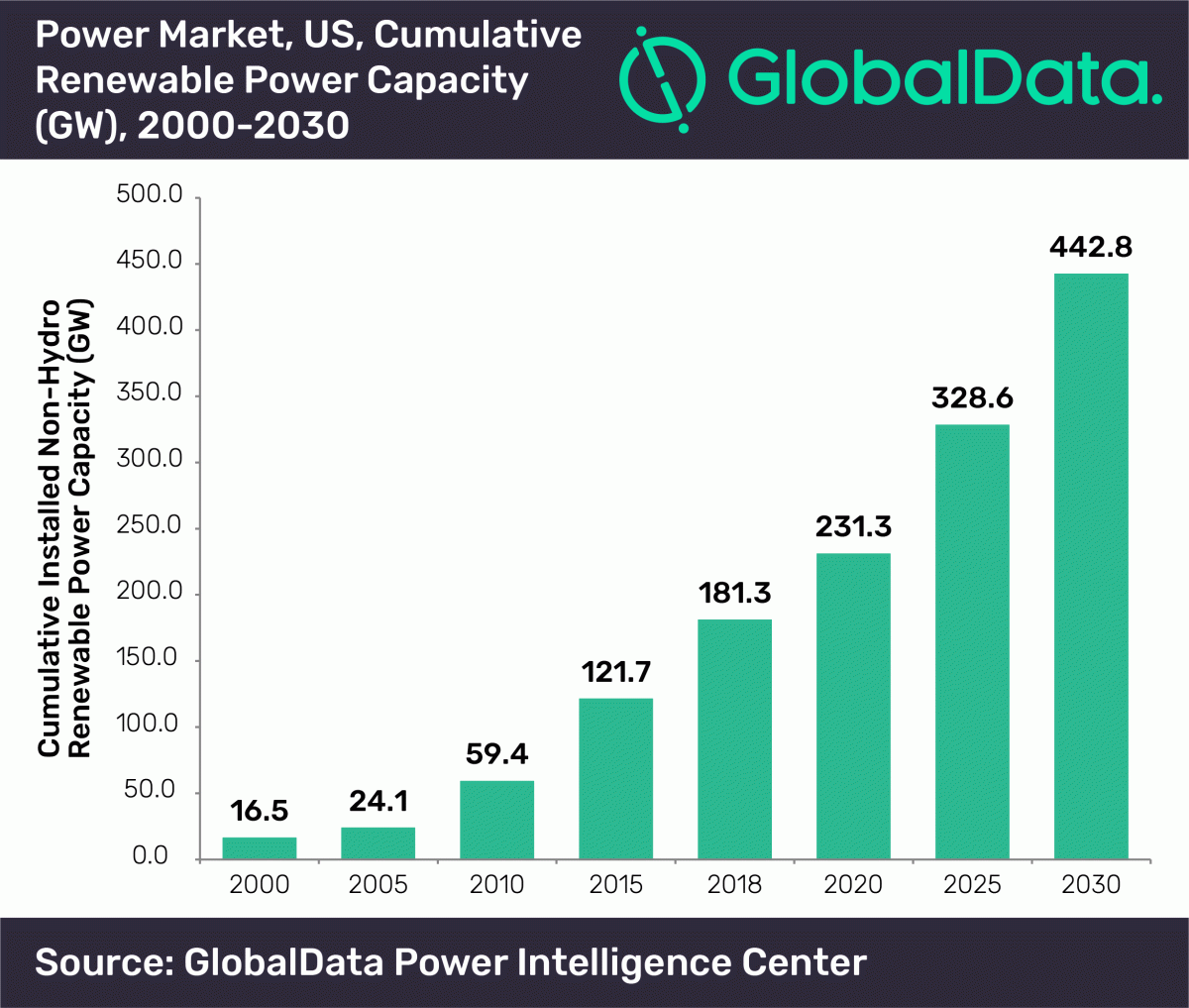 Se espera que la contribución de la energía renovable a la capacidad instalada total en EEUU se duplique del 15% en 2018 al 30% en 2030, alcanzando un total de 442.8 gigavatios (GW). El aumento representa una tasa de crecimiento anual (CAGR) del 7.3%, que se puede atribuir a más estados que adoptan y actualizan políticas de energía renovable, así como a los impuestos a las emisiones que gravan el costo de la generación de energía con combustibles fósiles, según la firma de análisis y datos GlobalData.