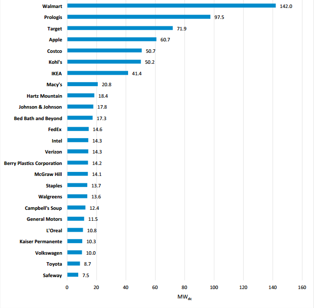 Wal-Mart continúa liderando el empuje de las instalaciones fotovoltaicas comerciales en EEUU, con 142 megavatios instalados en sus centros de trabajo, muy por delante de Prologis, que figura en segundo lugar, con cerca de 98 megavatios de capacidad solar. (ver ranking de las 25 maores)