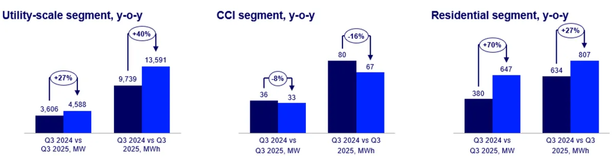 En conjunto, las instalaciones del Q3 aumentaron un 31% interanual, aunque el mercado cayó un 6 % en comparación con los máximos históricos del Q2 2025. El segmento de almacenamiento a escala de servicios públicos (utility-scale) impulsó el crecimiento, con 4,6 GW instalados en el Q3, un aumento interanual del 27%, con el 82% de la capacidad instalada concentrada en Texas y California.