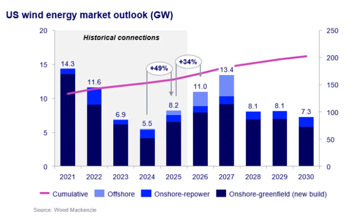 El sector eólico de EEUU repuntó con fuerza en 2025, con 8,2 GW de instalaciones —un aumento interanual del 49%—, y se prevé que alcance alrededor de 11 GW en 2026, según el informe US Wind Energy Monitor publicado por Wood Mackenzie.