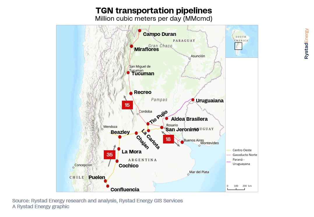 Argentina exporta flujos constantes de gas a Chile, principalmente a la zona central, cercana a las áreas de producción de gas de Neuquén. Los envíos comenzaron en octubre de 2021 y están respaldados por varios gasoductos a lo largo de la frontera chilena. En Magallanes, al sur de Chile, hasta 6,8 MMm³/d de gas argentino abastecen la demanda regional de metanol. La zona central de Chile, con mayor población, puede recibir hasta 14,2 MMm³/d, mientras que el norte, con fuerte demanda minera y eléctrica, puede recibir hasta 16,5 MMm³/d.