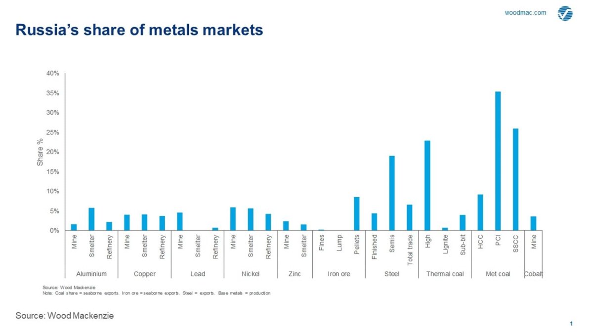 Un análisis de la participación de Rusia en la oferta de los mercados mundiales de metales y minería sugiere que los productos básicos a granel correrían mayor riesgo. Rusia abastece múltiples mercados de productos básicos, pero normalmente representa el 5% o menos de la producción o el comercio de metales básicos y tierras raras. Esta participación se compara con más del 15% de los comercios marítimos de carbón térmico y metalúrgico. Es importante destacar que Rusia suministra a Europa casi todo su PCI (inyección de carbón pulverizado) con bajo contenido de azufre y el 60% de su carbón térmico de alta energía.