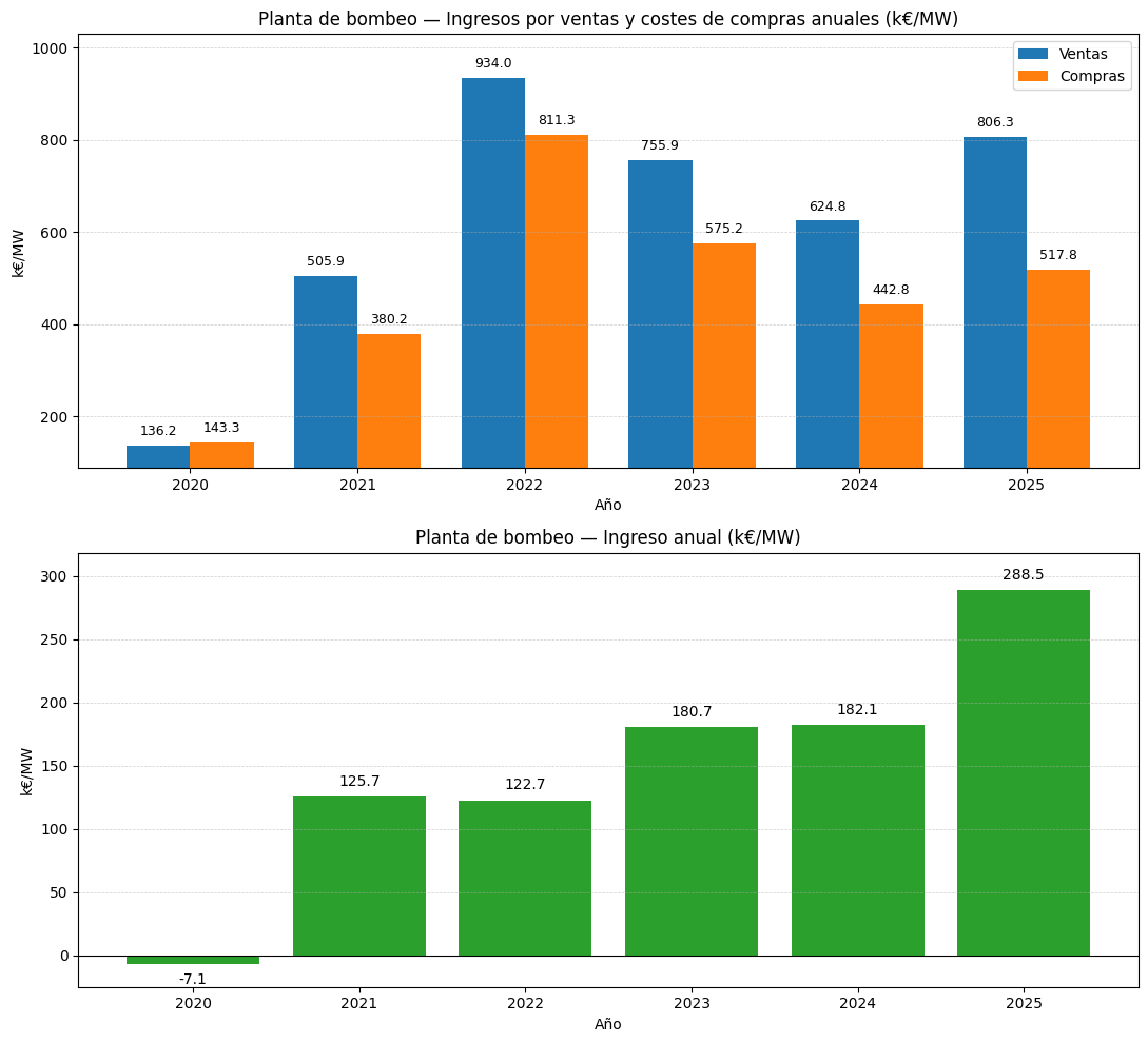 El ingreso anual neto se ha calculado a partir de las ofertas de compra y venta casadas de la planta en el mercado diario, como la diferencia entre el valor total de la energía vendida y el coste total de la energía comprada en cada año. Estos resultados representan el desempeño operativo de la planta de bombeo en función de las transacciones que ha realizado.