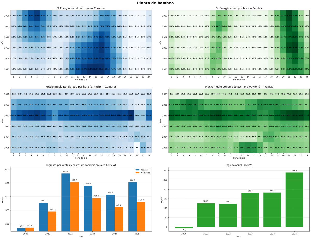 En conjunto, los ingresos anuales reflejan cómo la planta de bombeo ha ido capturando de forma creciente valor económico, aprovechando de manera más eficiente las diferencias temporales de precio observadas en sus operaciones casadas. El resultado pone de manifiesto el papel cada vez más relevante de la flexibilidad operativa del almacenamiento hidráulico dentro del sistema eléctrico, desde la perspectiva concreta de esta instalación.