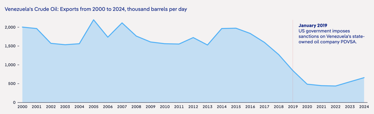 Impacto de las sanciones en las exportaciones de crudo venezolano (2000-2024, miles de barriles diarios)