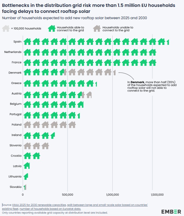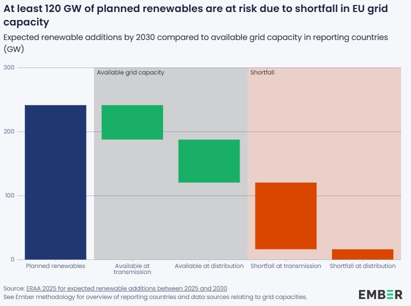 Un análisis de Ember, firmado por la analista Elisabeth Cremona, advierte que al menos 120 GW de proyectos renovables podrían quedar bloqueados por limitaciones en la red. En más de la mitad de los países analizados, la infraestructura actual no puede absorber la expansión prevista, con cuellos de botella especialmente graves en Países Bajos, Polonia, Portugal o Rumanía.