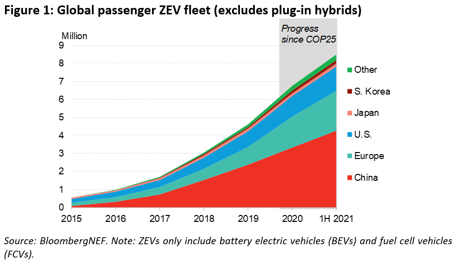 La flota mundial total de vehículos eléctricos de pasajeros y de pila de combustible asciende ahora a casi 13 millones, de los cuales 8,5 millones son verdaderos vehículos de cero emisiones (ZEV), ya sea de batería eléctrica o de pila de combustible (aún así, los vehículos de pila de combustible representan una fracción de ese total). ). Esta última cifra es superior a solo 4,6 millones en el momento de la COP25. Al mismo tiempo, para el primer semestre de 2021, la flota mundial de autobuses de cero emisiones ha aumentado en un 22% desde 2019, y esperamos que el 18% de todos los autobuses municipales en la carretera sean de cero emisiones a fines de 2021.