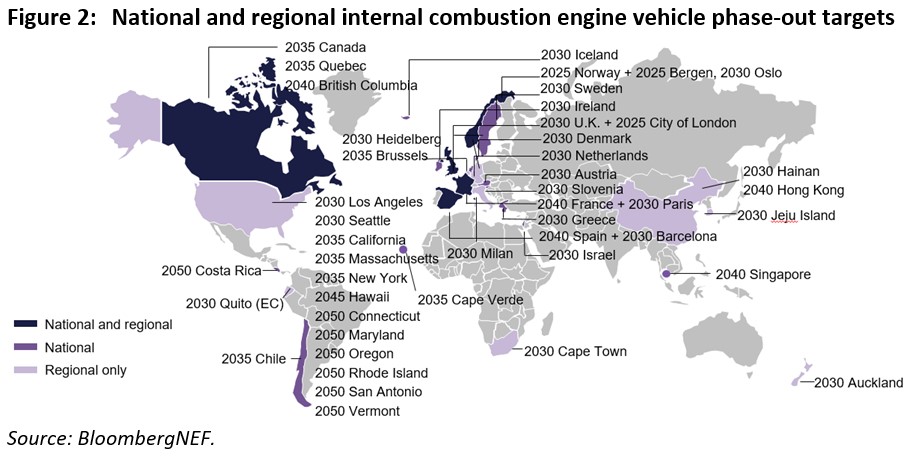 Los objetivos ambiciosos se complementan cada vez más con políticas y normativas que estimulan el crecimiento del mercado de vehículos de cero emisiones. Los estándares de emisiones de CO2 propuestos por la Unión Europea implican que los vehículos eléctricos deberían representar del 25% al 32% de las ventas en el bloque para 2025 y del 60% al 83% para 2030. Las normas de economía de combustible propuestas en EEUU implican una participación de mercado del 24% para vehículo eléctrico para 2026, en camino a una participación del 50% para 2030 según la orden ejecutiva del presidente Biden. China tiene como objetivo un 20% de vehículos de nueva energía para 2025, aumentando al 40% para 2030.