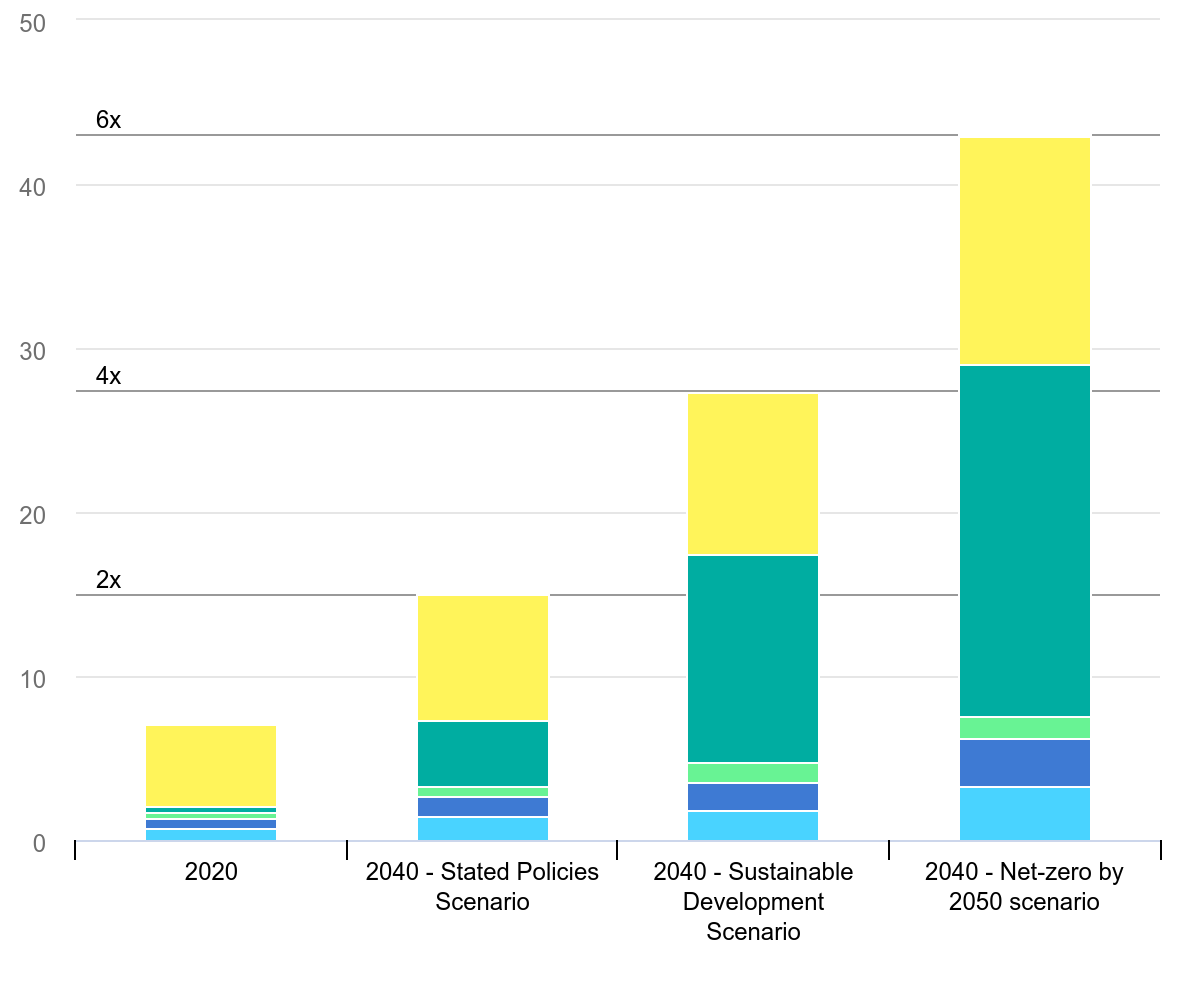 Demanda total de minerales para tecnologías de energía renovable por escenario, 2020 comparado con 2040. Imagen: IEA
