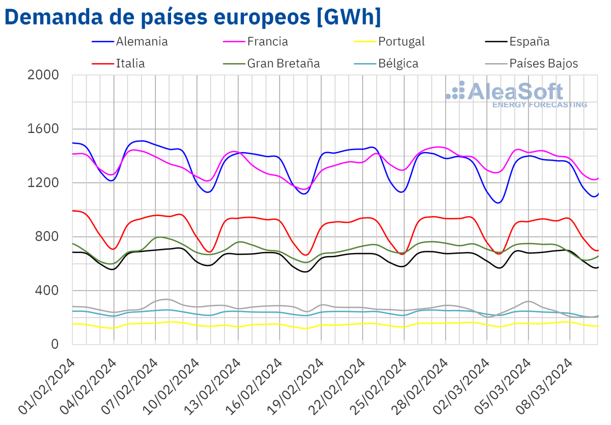 Para la semana del 11 de marzo, según las previsiones de demanda de AleaSoft Energy Forecasting, habrá un aumento en Alemania, Portugal, Gran Bretaña y los Países Bajos, revirtiéndose en la mayoría de los casos la tendencia a la baja de la semana anterior. Por el contrario, la demanda caerá en el mercado francés, español, italiano y belga.