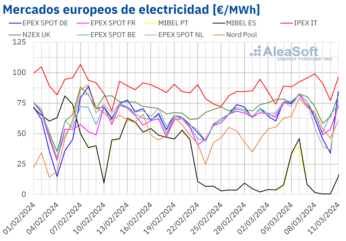 Fuente: Elaborado por AleaSoft Energy Forecasting con datos de OMIE, EPEX SPOT, Nord Pool y GME.
