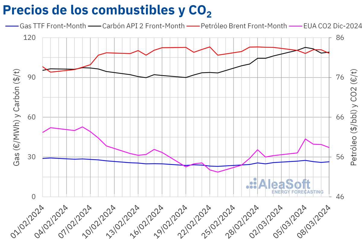 Por lo que respecta a los futuros de derechos de emisión de CO~2~ en el mercado EEX para el contrato de referencia de diciembre de 2024, la tendencia ascendente iniciada al final de la semana previa continuó hasta el martes 5 de marzo. Ese día, estos futuros registraron su precio de cierre máximo semanal, de 60,54 €/t. Según los datos analizados en AleaSoft Energy Forecasting, esta fue la única ocasión en la que los precios de cierre superaron los 60 €/t en las últimas cuatro semanas. En el resto de sesiones de la primera semana de marzo, los precios descendieron. Como resultado, el viernes 8 de marzo, el precio de cierre fue de 58,39 €/t, todavía un 3,6% mayor al del viernes anterior.