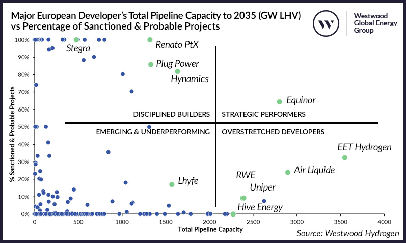 Para comprender mejor qué desarrolladores están progresando genuinamente, Westwood analizó la madurez y ambición de los proyectos usando su base de datos de Hidrógeno y la función Project Certainty. Al evaluar la combinación de capacidad aprobada y “probable” dentro del total de la cartera de cada desarrollador, se identificaron distintos enfoques estratégicos y se destacaron aquellos con mejores perspectivas de éxito en la próxima década.