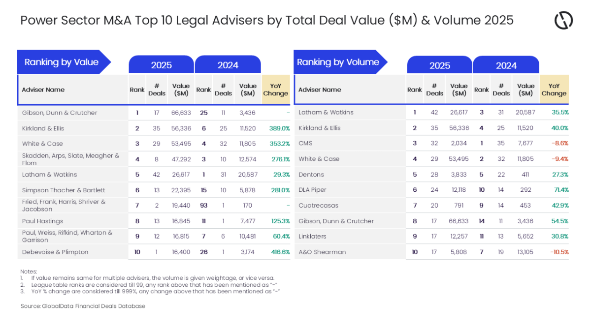 GlobalData ha publicado sus últimas tablas de clasificación de asesores financieros y legales, en las que ordena a las firmas según el valor y el volumen de las operaciones de fusiones y adquisiciones (M&A) en las que participaron dentro del sector energético a lo largo de 2025.