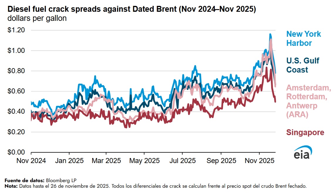 Los márgenes globales de refino para el diésel se han ampliado desde finales de octubre y han alcanzado su nivel más alto del año, tras las interrupciones de las refinerías en Rusia y Oriente Medio, y las nuevas sanciones al petróleo crudo ruso. Esto ha provocado una producción de refinería limitada y una disminución del suministro mundial de diésel, según la Administración de Información Energética de EEUU (EIA).