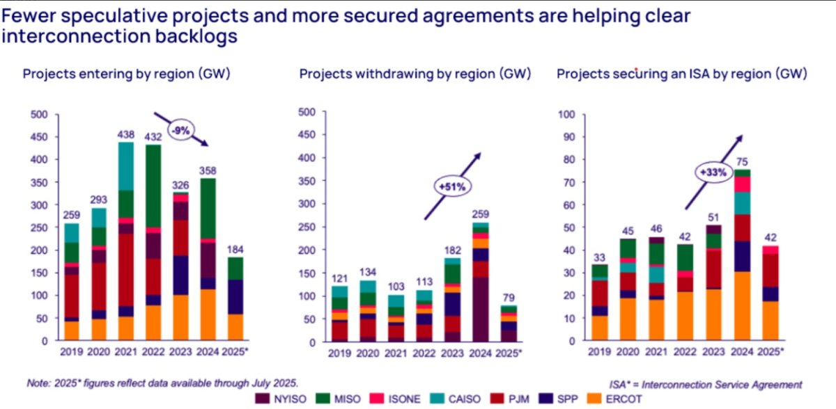 El gas natural ha visto un aumento en las solicitudes de interconexión desde 2022, añadiendo 121 GW de capacidad. Esta tendencia ha continuado en 2025, con nuevas solicitudes para generación con gas ya rompiendo récords anuales a mitad de año. Sin embargo, el número de acuerdos exitosos de interconexión con gas ha disminuido un 25 % desde 2022, principalmente en las regiones PJM, MISO y ERCOT.