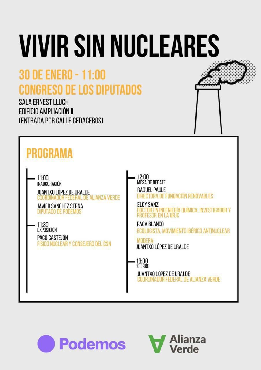 Para rematar este ataque organizado contra la energía nuclear, los partidos políticos Alianza Verde (Sumar) y Podemos han organizado en el Congreso de los Diputados este viernes una jornada contra la energía nuclear titulada Vivir sin nucleares.