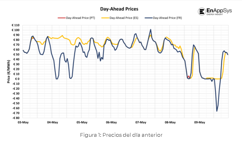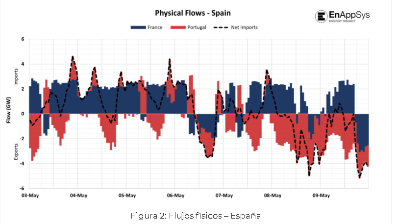 Es muy probable que los precios negativos se den más debido a importaciones, por medio de los interconectores. Por ejemplo, durante la noche del domingo 9 de mayo, los precios negativos hubiesen ocurrido, de no ser porque aún no están en vigor (véase figura 1).